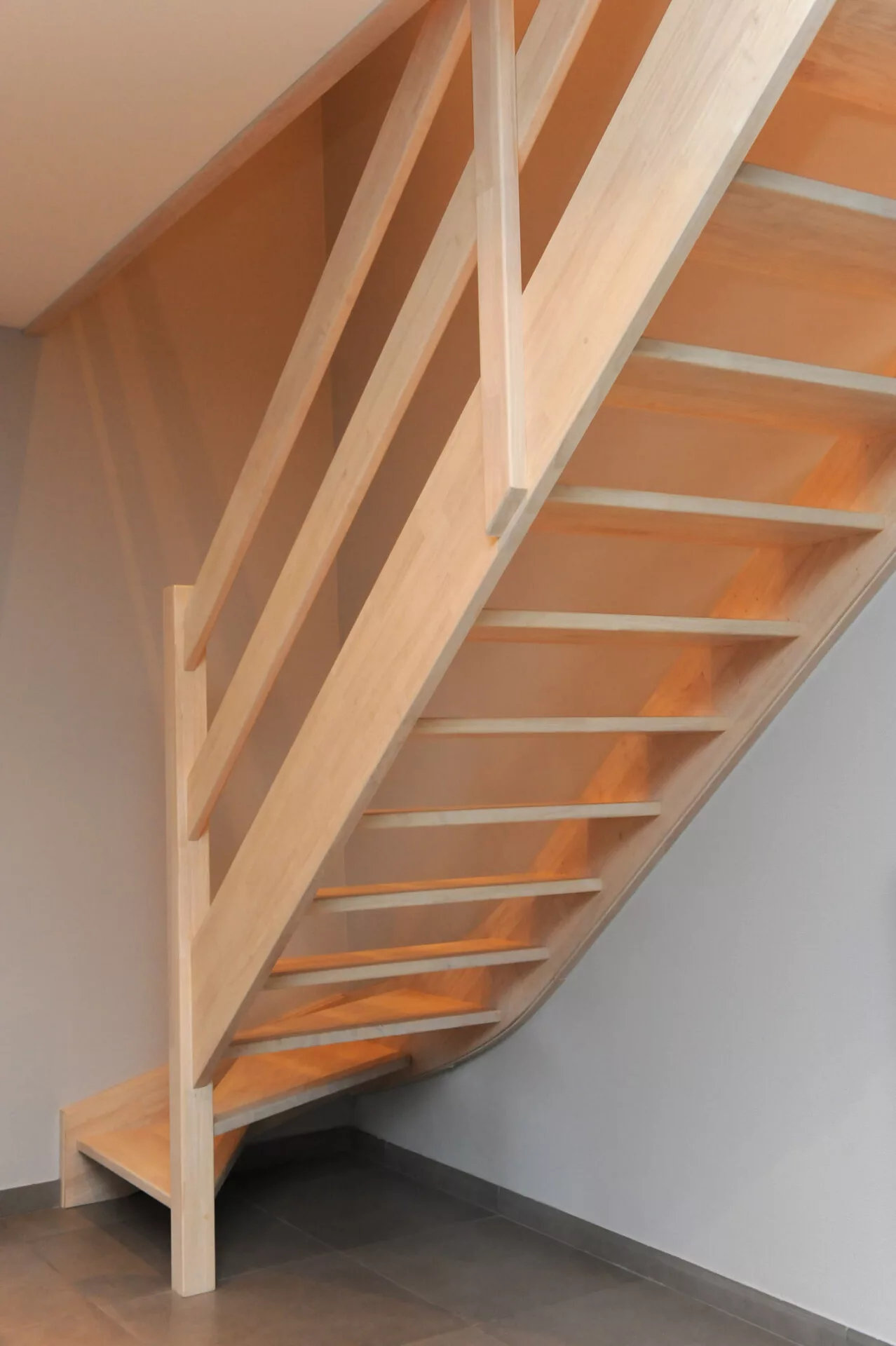 Deze gesloten rechte trap in eik met leuning type 1 werd volledig gemonteerd naar boven gebracht. Dankzij drie sterke eigen helpers en onze plaatsingshulp stond hij in 2,5 uur perfect op z’n plek.